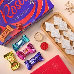 2 Designer Beaded Rakhi Set With Kaju Katli N Cadbury Roses Box