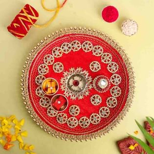 • - Red Tika Thali With Golden Kundan Flower And Beaded Design Border