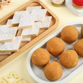 A trio of tradition, elegance, and heartfelt connection—this Rakhi set features three beautifully designed threads, each crafted to symbolise the bond you share with your brothers. Whether they’re protective, playful, or the peacekeeper, there’s a Rakhi for every role they’ve played in your life. Complementing the emotion are two classic Indian sweets: melt-in-the-mouth Kaju Katli and rich Besan Ladoo. Whether your brothers are gathered at home or living in Canada, this set ensures your love reaches them, tied in tradition and sealed with sweetness.
