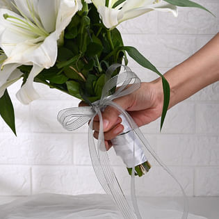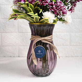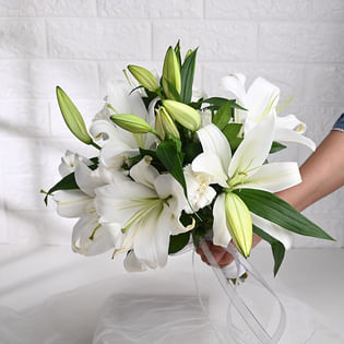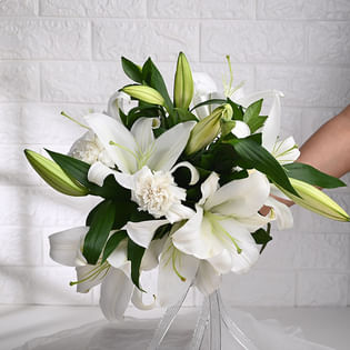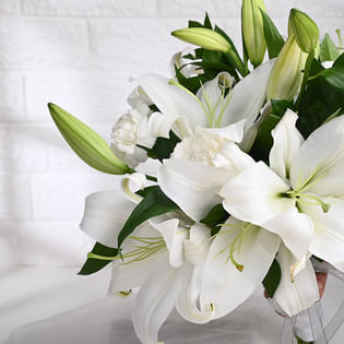 • - Arrangement of 6 Purple Orchids <li> 10 White Carnations