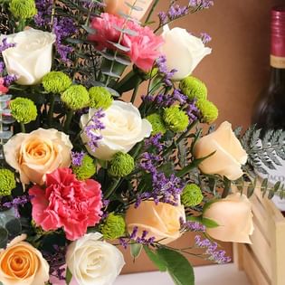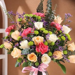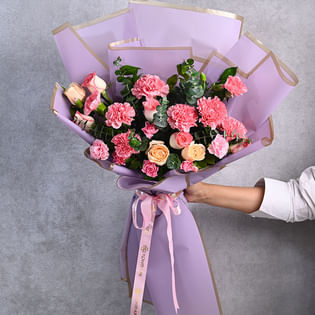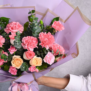 • - Bouquet of 11 White Carnations, 6 Pink Carnations & 8 Pink Roses