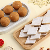 The warmth of Raksha Bandhan comes alive with this Bhaiya-Bhabhi Rakhi set, featuring a stunning floral-design Rakhi and an elegant peach Lumba. Crafted to symbolise eternal love and protection, these threads whisper promises of togetherness. Paired with the timeless sweetness of soft Besan Ladoos and rich Kaju Katli, this set weaves a tapestry of shared laughter, fond memories, and endless affection. As you tie the sacred knot, you honour not just a bond but a lifelong journey of loyalty, respect, and joy with your beloved Bhaiya and Bhabhi.