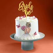 Romance and elegance blend seamlessly in this cake, designed to make bridal celebrations unforgettable. Adorned with dainty pink butterflies and an illustration of a bride holding a bouquet, it promises heartfelt memories. A golden “Bride to Be” topper crowns the cake, adding sparkle and festivity. Beneath the elegant design lies a soft, moist sponge paired with layers of frosting that bring richness to every bite. Perfect for bridal showers, bachelorette parties, or pre-wedding surprises, this cake is the sweetest way to honour her new journey.