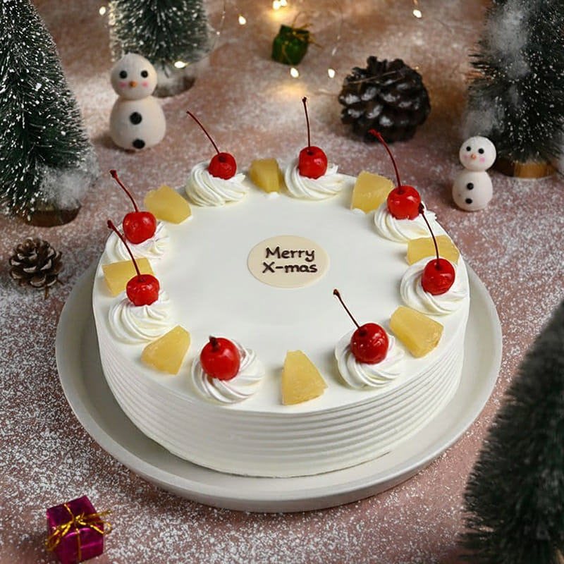 Celebrate the joy of the season with this delightful Christmas Pineapple Cake! Topped with juicy cherries, luscious cream swirls, and pineapple chunks, this beautifully crafted cake is a treat for both the eyes and the taste buds. Perfect for spreading festive cheer, its soft, spongy layers and refreshing pineapple flavor make every bite unforgettable. Surrounded by holiday décor, it’s the ideal centerpiece for your Christmas celebrations. Share sweetness and smiles with this irresistible delight!
