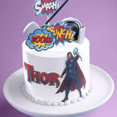 Summon the power of Asgard with this mighty Thor-themed masterpiece. This heroic creation features a crisp white design crowned with Thor's legendary hammer and helmet in stunning detail. The God of Thunder himself appears ready for action, bringing authentic Marvel magic to your celebration. The "Smash" logo adds dynamic energy to this powerful design. Ideal for Marvel fans and superhero enthusiasts, this customizable cake can be prepared in any flavor you desire, ensuring your celebration channels the strength and taste of a true Avenger's feast.