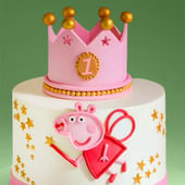 Celebrate your special day with this magical Peppa Pig themed cake! The smooth white base is beautifully decorated with a pink crown topped with a golden "1" and a smiling Peppa dressed as a fairy, ready to sprinkle some magic. Star-shaped sprinkles surround the cake, adding a whimsical touch. The cake is personalised with a sweet name inscription, making it perfect for a first birthday party or any celebration. Delight the kids and Peppa fans, and make the occasion even more special with this charming cake.
