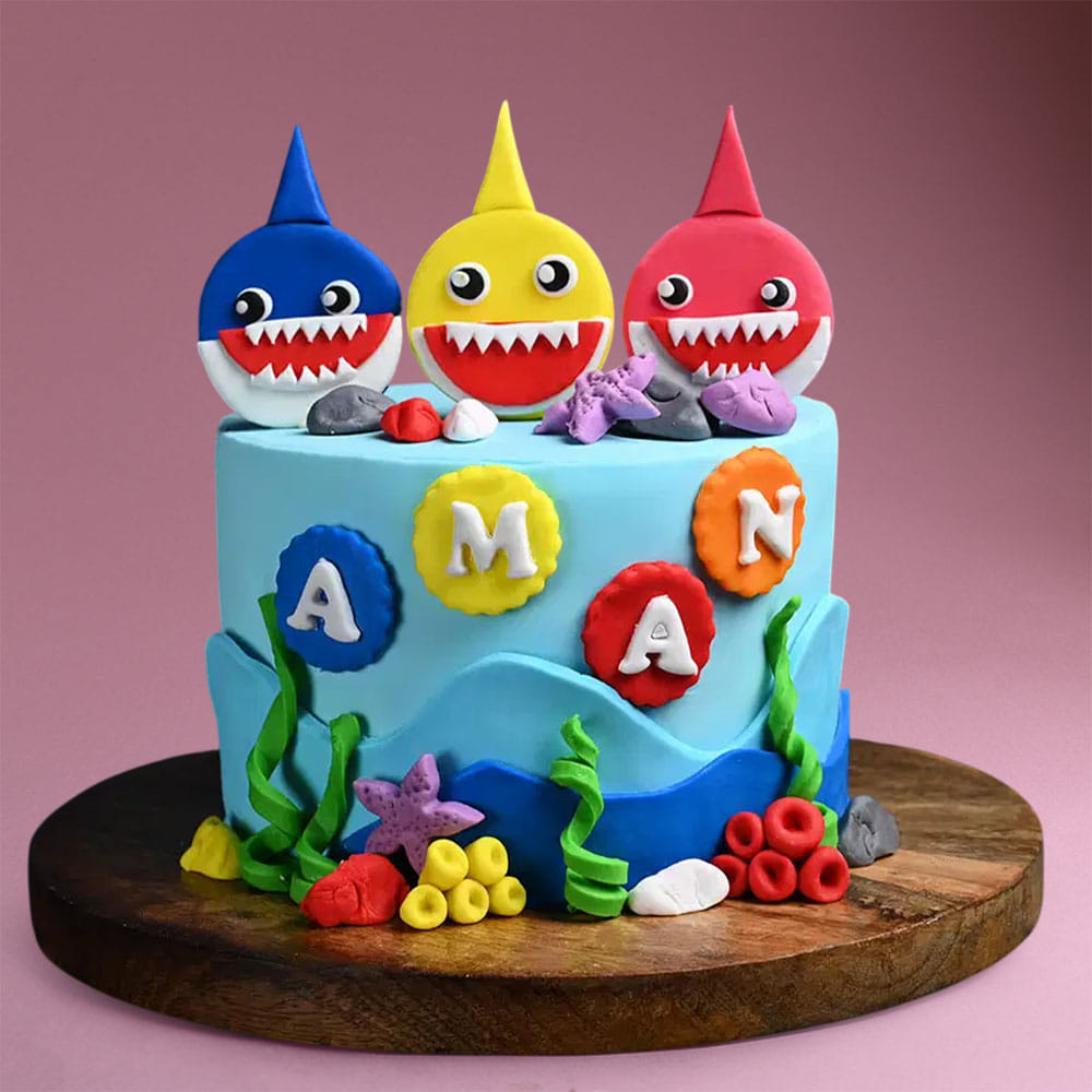 A bright ocean-blue base is adorned with waves, seaweed, bubbles, and coral accents, framing three smiling baby sharks in cheerful colours. The playful design instantly catches the eye and brings underwater fun to the table. Beneath the theme lies a moist sponge paired with smooth, creamy layers that balance flavour and texture beautifully. Perfect for young fans of Baby Shark or anyone who loves joyful designs, it makes a thoughtful gift for birthdays and special occasions, adding both visual charm and delicious taste to every celebration.