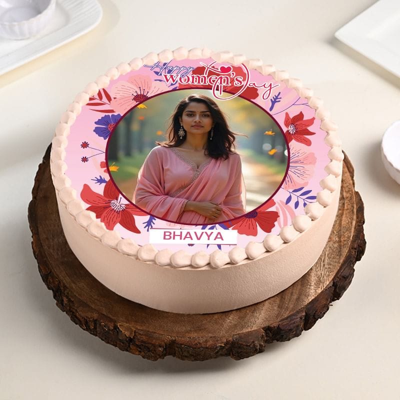 Make her feel truly special with this stunning Women’s Day cake, beautifully adorned with a personalised photo framed by vibrant florals. The soft pastel backdrop paired with a sweet “Women’s Day” message creates the perfect blend of elegance and love. Customise it with her favourite flavour and name to turn it into a heartfelt surprise. Ideal for your mum, sister, partner, or friend, this cake is more than just a dessert—it’s a sweet way to show her she’s cherished today and every day!