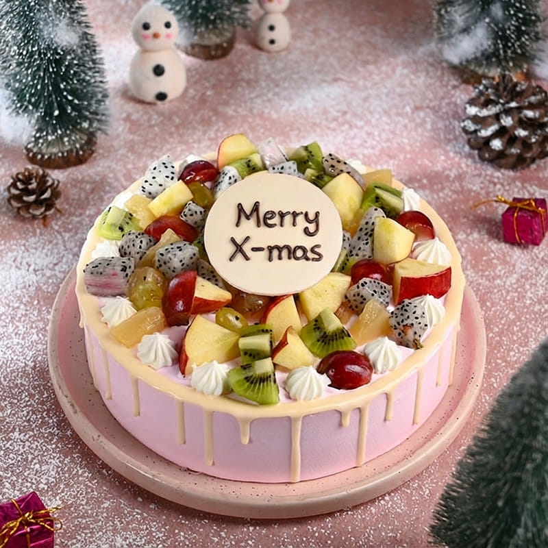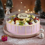 Brighten your Christmas celebrations with this delightful Fresh Fruit Cake! Bursting with the goodness of kiwi, dragon fruit, grapes, apples, and pineapples, it’s a colorful feast for the senses. Topped with luscious cream swirls and a festive "Merry Christmas" tag, this cake combines the freshness of fruits with the indulgence of a soft, moist base. Perfect as a centerpiece or a gift, it’s a delicious way to share the joy of the season with loved ones. Celebrate the holidays with this irresistible, fruity delight!