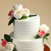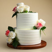 A two-tier cake with is a perfect blend of simplicity and elegance. The smooth, white icing creates a clean, refined look, while the delicate, soft pink and white roses, strategically placed on each tier, bring a touch of natural beauty. The subtle striped design on the cake’s surface adds texture, creating a sophisticated, yet understated elegance. Perfect for weddings, anniversaries, or any celebration that calls for a graceful and charming centerpiece. This cake is sure to leave a lasting impression with its timeless appeal.