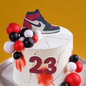 A tribute to style, passion, and the spirit of sport, this Jordan sneaker-themed cake is a showstopper. The sleek white base is brushed with bold red strokes, mirroring the game's energy. A striking ‘23’ takes centre stage, symbolising the legacy of basketball’s greatest icon. Around it, clusters of spherical accents in black, red, and white add a playful yet powerful edge, while a detailed sneaker topper crowns the design with flair. Perfect for gifting, it’s a statement for every sneakerhead, sports lover, or dreamer chasing greatness.