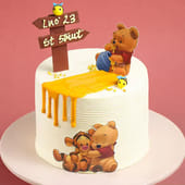 Celebrate childhood nostalgia with this delightful Winnie cake. This charming creation showcases beloved characters Pooh and Tigger surrounded by adorable bees and whimsical decorative tags. The elegant white design is beautifully accented with a golden honey drip, capturing Pooh's favorite treat perfectly. This cake brings classic storybook charm to any celebration, whether it's a birthday party or baby shower. Customize the flavor to your liking and watch faces light up with pure joy as this enchanting dessert becomes the centerpiece of your special occasion.