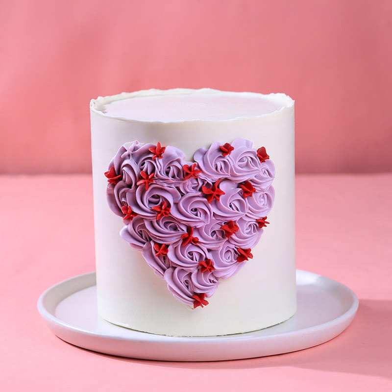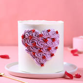 This tall, chocolate-flavoured cake is the epitome of elegance and romance. Adorned with a beautifully crafted cream heart on the side, its delicate layers are coated in smooth, velvety cream, making each bite a delightful treat. The soft lavender and red rose accents add a burst of colour, symbolising love and passion. Whether you're celebrating an anniversary, Valentine’s Day, or simply cherishing a moment with someone special, this cake makes for a perfect romantic gesture that speaks from the heart.