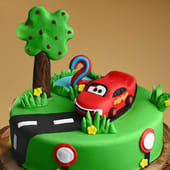 A bright green base sets the stage for a racing adventure. At the centre, a vibrant red Lightning McQueen car with big animated eyes steals the spotlight, surrounded by tufts of grass and yellow flowers that lift the design. A tall tree stands proudly at the back, giving the scene a playful outdoor touch, while a number topper marks the age of the little racer. Inside, soft sponge and creamy layers promise a taste as fun as the look. Perfect for gifting, it’s a birthday treat that makes young Cars fans feel like champions of their own race.