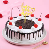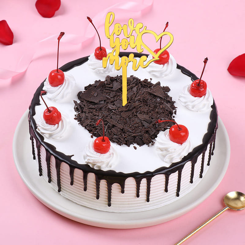 Indulge your partner in this decadent black forest cake, a true symbol of love, topped with a golden "Love You More" topper. The rich layers of chocolate and fresh cream, paired with the vibrant cherries, make every bite a sweet celebration of affection. Whether it's for Valentine’s Day or any romantic occasion, this cake expresses love in the most delicious way. Perfect for creating unforgettable moments, it is a heartfelt gift that will leave your loved one feeling cherished and adored.