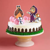Bring joy to any occasion with this delightful Masha and the Bear Cake. Featuring the playful duo of Masha and her cuddly bear friend, this cake is a treat for both the eyes and the taste buds. The pristine white base is adorned with vibrant pink and silver balls, creating a fun and festive vibe. The grassy green border and chocolate picket fence add a charming touch, making it the perfect centrepiece for birthdays or any special celebration. A whimsical, sweet way to share the magic of Masha and the Bear!