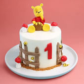Bring sweetness and charm to your celebration with this adorable Pooh Bear creation. Featuring a delightful white design with a charming honey pot centerpiece, this cake captures Pooh's love for his favorite treat perfectly. Colorful fence mushrooms, tiny bees, and the lovable Pooh character add whimsical charm to this enchanting dessert. Perfect for birthdays, baby showers, or any celebration needing a touch of childhood magic. Customize this delightful cake in your preferred flavor combination to create a truly memorable and delicious centerpiece that guests will adore.