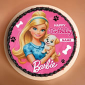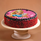 Add a touch of magic to your celebration with this delightful red velvet photo cake featuring Barbie and her cute puppy. The soft, moist layers of red velvet are paired with a rich, creamy frosting, offering a perfect blend of flavour and charm. Customised with your special birthday message, this cake brings a personal and fun twist to the occasion. With Barbie's vibrant design, it's sure to be the highlight of any party, making it an unforgettable treat for your little one’s big day!