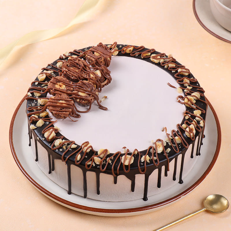 Elevate your chocolate game with this exquisite Ferrero Rocher cream cake. Topped with luscious Rocher chocolate bites and crushed nuts, this confection is a true indulgence for the senses. The border of the cake is adorned with a rich chocolate ganache, elegantly dripping down the sides for a touch of drama. With its rich chocolate sponge and cream, this cake is the ultimate treat for chocolate lovers. Perfect for any occasion, this masterpiece is a true work of art that exudes refined elegance and exceptional attention to detail. So indulge in this sensational chocolate confection that's sure to delight and captivate all who behold it.