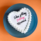A playful twist on pre-wedding sweetness, this heart-shaped Bride To Be cake brings the perfect mix of humour and celebration. The clean white finish, neat piping and bold lettering make it stand out instantly, giving the moment a cheeky spark that friends will love. Inside, soft layers promise a smooth, comforting bite that feels just right for a night filled with laughter, photos and heartfelt toasts. It’s the kind of cake that becomes part of the memory—fun, bold and made to honour the bride’s big step in the most unforgettable way.