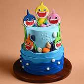 An underwater fantasy comes alive in this Smiley Sharks tiered cake, designed to spread pure happiness. The bottom tier is wrapped in deep blue waves with pearl-like bubbles, setting the scene of the sea. The upper tier shines in a lighter blue, decorated with colourful seashells, playful corals, and strands of green seaweed swaying on the sides. Vibrant sharks in cheerful hues beam with wide smiles, creating a lively family scene. Perfect for gifting, it captures the magic of the ocean and turns any celebration into a joyful splash of love and laughter.