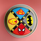 Bring the power of your favourite superheroes to life with this vibrant, action-packed cake! Featuring iconic symbols from Superman, Batman, Iron Man, and Spider-Man, this colourful cake is perfect for fans of all ages. The bold, bright colours—red, yellow, blue, and grey—are divided with a starry black border, creating a dynamic and fun design. A perfect treat to celebrate a superhero fan's special day, this cake promises to add excitement and sweetness to any occasion. Let the superhero fun begin!