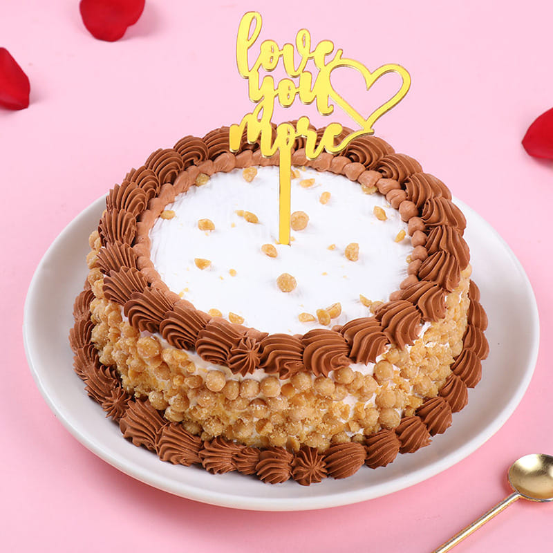 Treat your partner to this delectable butterscotch cake, crowned with a golden "Love You More" topper. The moist sponge layers, crunchy bits on the sides, and creamy decorations all come together beautifully, offering irresistible taste and visuals. Exuding a romantic aura, this cake is perfect for Valentine’s Day or any occasion where you want to express just how much you care. Each bite offers a sweet reminder of your never-ending love, making it the ideal gift to celebrate special moments with your special someone.