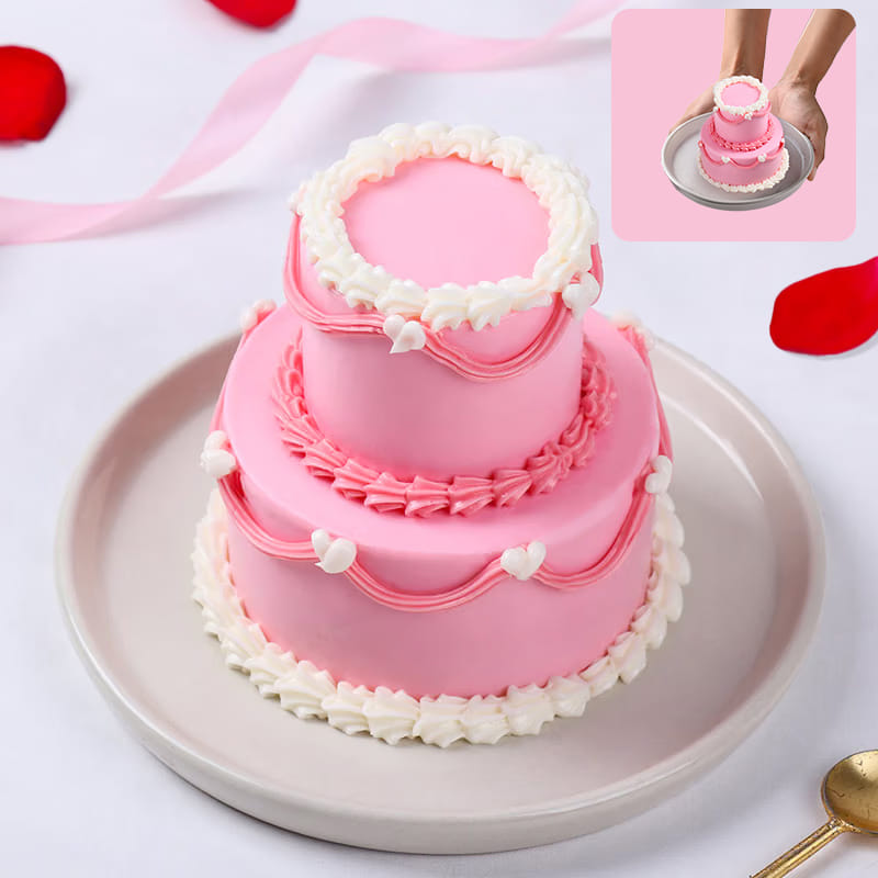 Perfect for sharing love, this two-tier cake makes any celebration feel extra special. Its soft pink layers and delicate white accents create an enchanting, romantic atmosphere, ideal for anniversaries, Valentine's Day, or simply surprising someone with a sweet gesture. Each layer is beautifully adorned, adding a personal touch to your gift. Whether shared between two or enjoyed as part of a gathering, this cake expresses affection in the most delicious way. Gift it to someone you cherish and let love be celebrated in both taste and style.