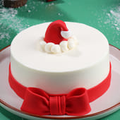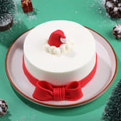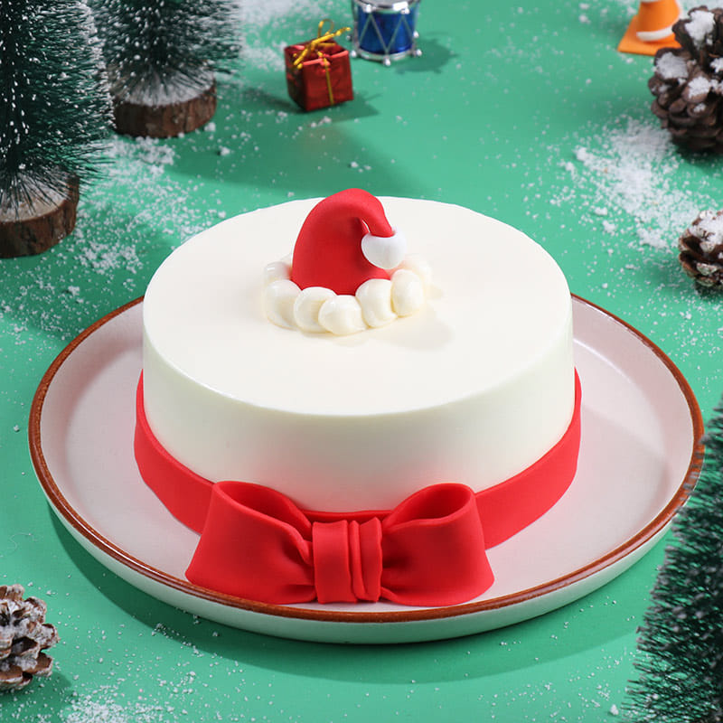 This Christmas-themed cake brings a touch of elegance to the season with its smooth white finish and bright red detailing. A handcrafted fondant Santa cap sits playfully at the centre, surrounded by soft whipped swirls that add a snowy effect. The bold fondant ribbon wrapped around the base gives it a gift-like charm, perfect for holiday tables, parties or thoughtful surprises. Light, delicious and beautifully designed, it captures the magic of Christmas in a simple yet striking way. A festive treat that feels joyful, inviting and ready to delight everyone who sees it.