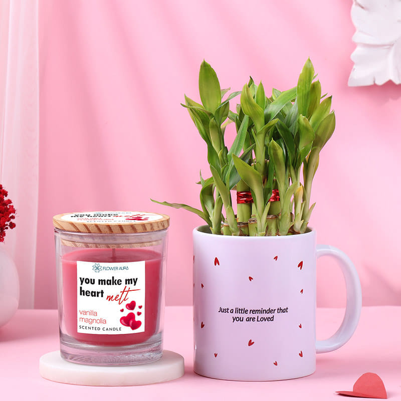 Show your affection in a way that speaks to the heart with this beautiful and thoughtful gift. A lush 2-layer bamboo plant thrives in a charming ceramic mug, imprinted with the sweet reminder, "Just a little reminder that you are loved." Paired with a Vanilla Magnolia scented candle, its warm glow and soothing fragrance make the perfect touch for any romantic occasion. Whether it’s for Valentine’s Day, an anniversary, or simply a spontaneous gesture of love, this thoughtful gift promises to brighten their day and their space, making them feel cherished and cared for. Price Breakup: Bamboo Plant In Lil Hearts Love Mug ₹896, Vanilla Magnolia Scented Candle ₹299