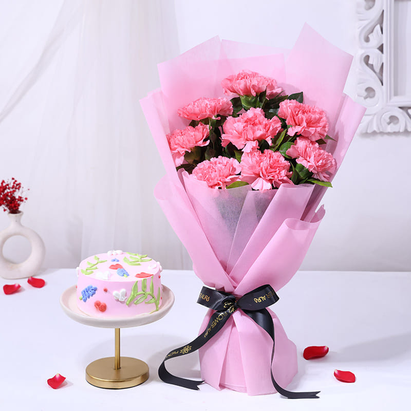 Presenting a delightful combo curated to express love in the sweetest way. It features a bouquet of eight fresh pink carnations, carefully arranged and wrapped in elegant pink paper for a gentle, romantic touch. Paired with the blooms is a chocolate-flavour cake, beautifully finished with a delicate floral design that feels celebratory yet graceful. Perfect for Valentine’s Day and other romantic surprises, this combo speaks of affection, warmth, and care, making every moment feel a little more special and truly memorable. Price Breakup: Petals N Hearts Chocolate Cake ₹730, Blushing Dreams Of Love Carnations ₹645