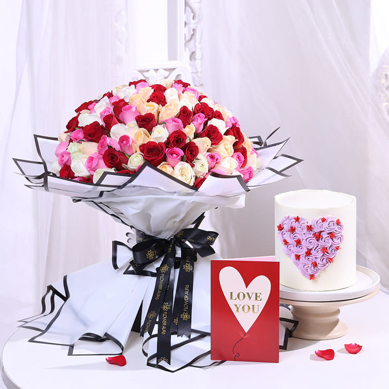 Make your sweetheart feel extra special with this stunning Valentine gift set. The bouquet features 200 vibrant mixed roses in elegant white premium paper, a breathtaking display of love and affection. Accompanied by a "Love You" greeting card and a chocolate cake decorated with a heart of creamy frosting, this thoughtful hamper is the perfect way to express your deepest emotions. Whether it's for Valentine’s Day or any day during Valentine’s week, this romantic gesture will leave a lasting impression. Price Breakup: Lavender Love Heart Chocolate Cake ₹1341, Mixed Roses Of Passion N Grace ₹9595, Love Greeting Card ₹129