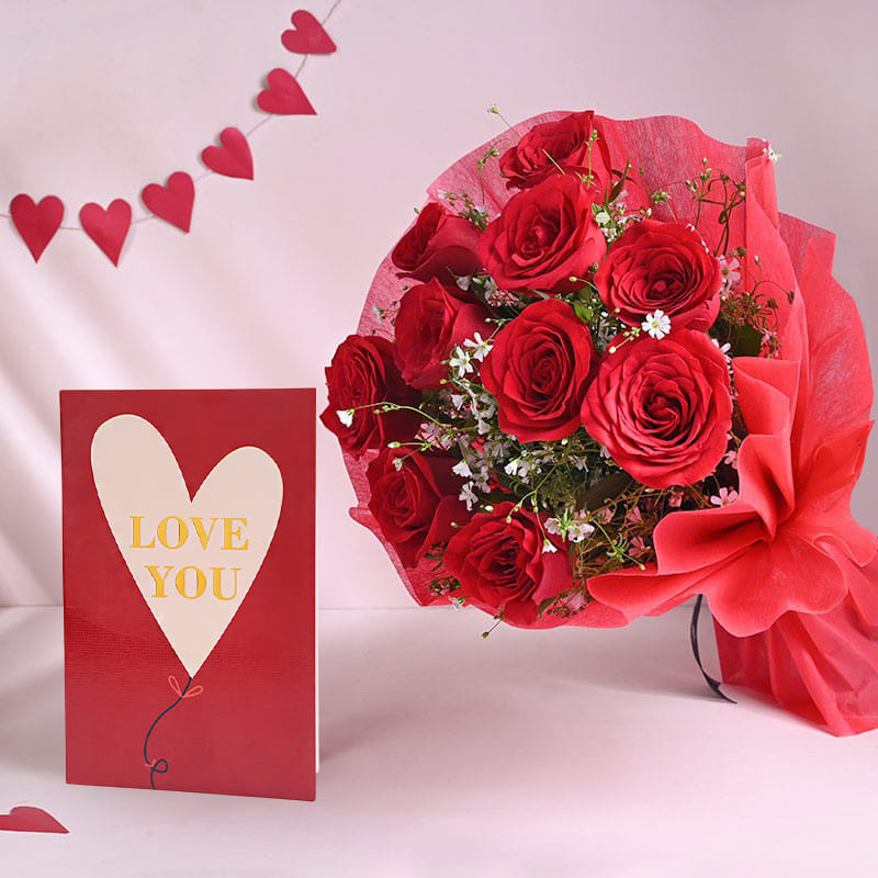 If you can't express in words how much you love your beloved then choose our hamper of love perfection. It has a bunch of fresh red roses along with a thoughtful card that can truly express your heartfelt thoughts. So, whats the wait for? Place your order now! Price Breakup: 10 Red Roses Bouquet ₹770, I Love You Greeting Card ₹125