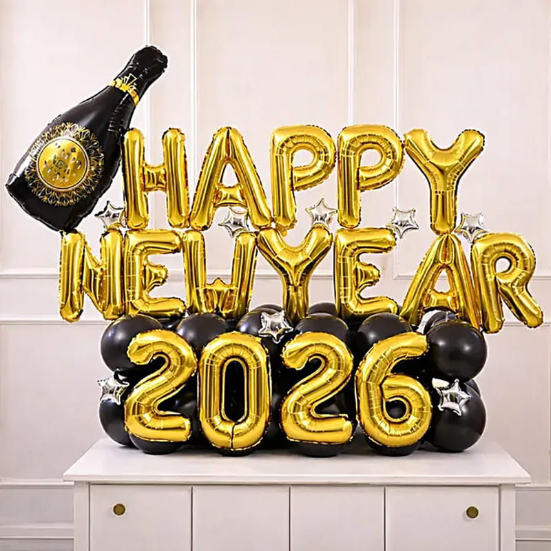 Ring in the New Year with this glamorous Happy New Year 2026 balloon bouquet, featuring shiny gold foil letter balloons, bold “2026” number balloons, a stylish champagne bottle foil, and black balloons accented with silver stars. Perfect for New Year’s Eve parties, countdown celebrations, and photo backdrops, this elegant arrangement adds instant sparkle and festive charm to your celebration.