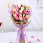 Love finds a beautiful expression in this elegant cake and flower pairing. A fresh bouquet of peach roses and light pink roses is wrapped in premium purple paper, finished with a soft ribbon for a graceful touch. Paired alongside is a pastel-themed chocolate cake, crowned with a Love You More topper. Perfect for romantic moments like anniversaries, Valentine’s Day, or heartfelt surprises, this gift balances sweetness and sentiment perfectly. Thoughtfully arranged and ready to impress, it turns affection into a gesture that feels personal, indulgent, and unforgettable. Price Breakup: Whispers Of Blush N Peach Roses ₹1150, Sweetest Love Reveal Cake ₹745