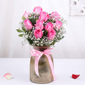 A beautiful blend of sweetness and blooms, this romantic gift pairs soft revival pink roses with delicate gypsos, arranged gracefully in a vase tied with a gentle ribbon. Alongside sits a chocolate cream cake, layered with smooth indulgence and finished with a charming Love You More topper. Together, they create a heartfelt expression that feels thoughtful and complete. Perfect for Valentine’s Day, anniversaries, or other romantic occasions, this set turns love into something you can see, share, and savour in one memorable moment. Price Breakup: Valentine Blush Hearts Choco Cake ₹700, Romantic Artistry Of Pink Roses ₹1145