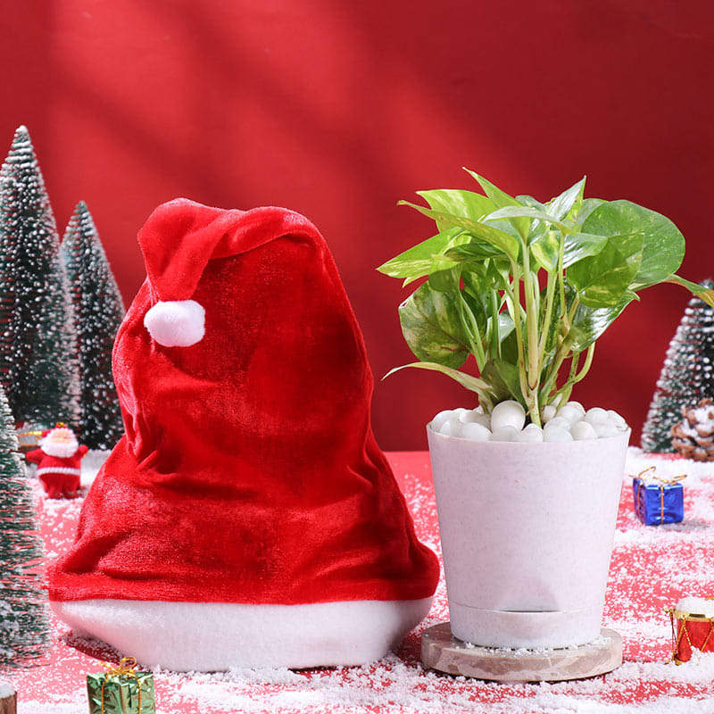 Warm Christmas charm meets a touch of freshness in this thoughtful little duo. The money plant in its white taper pot brings gentle energy and hope for new beginnings, making it a beautiful symbol for the season. Beside it, the soft Santa cap adds a playful spark, the kind that instantly brings back childhood memories of laughter, stockings and cozy winter excitement. Together, they create a gift that feels light-hearted yet meaningful, perfect for brightening someone’s desk, home or festive corner. A cheerful way to say you’re wishing them joy, luck and a season filled with warmth. Price Breakup: Golden Money Plant In White Pot ₹546, Santa Claus Red Cap ₹149