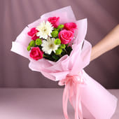 A charming duo crafted to brighten any moment. The bouquet features pink roses, white gerberas, and green button daisies arranged in soft pink non-woven paper, giving it a fresh, graceful look. Paired with a pretty pink cake that mirrors the bouquet’s sweet tones, this combo makes a thoughtful gift for birthdays, anniversaries, or simple days when you want someone to feel loved. Its gentle colours, elegant wrapping, and matching cake create a warm, joyful surprise that adds sweetness to every celebration. Price Breakup: Bows N Blush Cream Cake ₹600, Blossoms In Hush ₹695