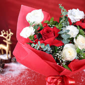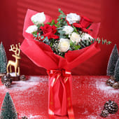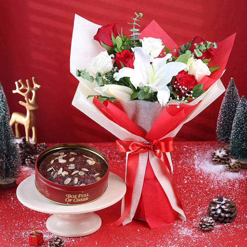 Festive charm takes a graceful turn with this stunning pairing. The bouquet brings together three red roses, three white roses, a serene white lily, and fresh eucalyptus, all wrapped in red and white non-woven paper that feels instantly celebratory. Alongside it sits a rich plum cake layered with classic Christmas warmth. Together, they create a gift that feels thoughtful, bright, and perfect for sharing cosy holiday moments with the people who matter most. Price Breakup: Christmas Plum Cake 400 gm ₹500, The Symphony Of Classic Blooms ₹1095