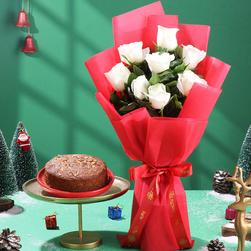 Festive moments feel sweeter with this charming gift combo. The rich & finely baked plum cake brings warm, classic Christmas flavours, while the bouquet of fresh white roses adds a calm, elegant touch against its bold red non-woven wrapping. Together, they create a Xmas gift combo that feels thoughtful, celebratory, and full of seasonal cheer. Ideal for Christmas surprises, cosy family visits, or sending love across the miles. It’s a simple yet heartfelt way to brighten someone’s holiday. Price Breakup: Loaded Plum Cake (400 gm) ₹750, Timeless Whispers of Winter Roses ₹745