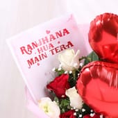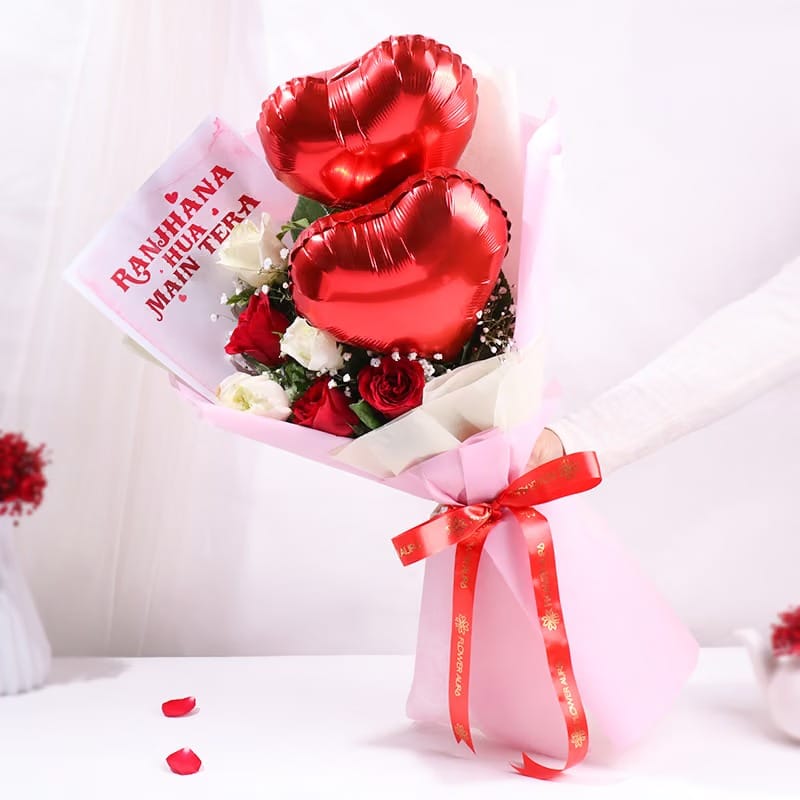 Send love and affection wrapped in a beautiful gesture with our Balloon Bouquet. This stunning arrangement features a mix of elegant red and white roses, delicately nestled among soft baby’s breath. Topped off with two heart-shaped foil balloons, it’s the perfect gift for any occasion. The bouquet is carefully wrapped in a premium non-woven sheet, tied with a pink ribbon for a touch of grace. Whether for a birthday, anniversary, Valentine’s Day, or just to express your feelings, this thoughtful bouquet will surely make their day extra special.