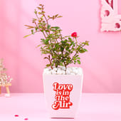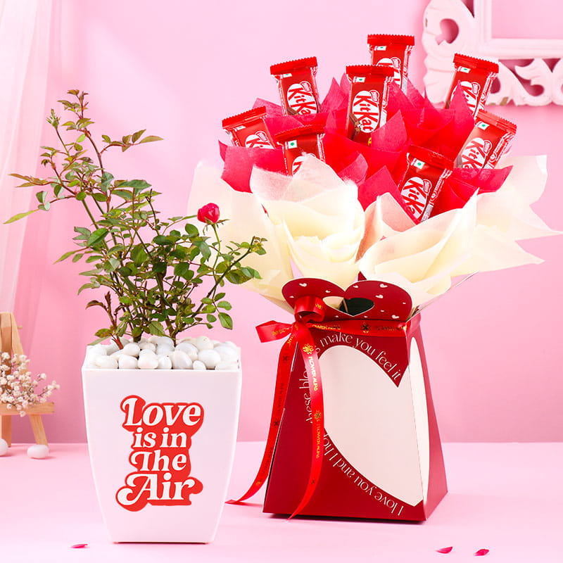 Romantic, cheerful, and thoughtfully put together, this gift combo captures love in the sweetest way. It features a delicate rose plant nestled gracefully in a white planter, finished with a Love is in the Air sticker. White pebbles add a clean, calming contrast, letting the fresh blooms stand out beautifully. Paired with the plant is a striking arrangement of KitKat chocolates, wrapped to delight at first glance and enjoyed in every bite. Perfect for Valentine’s Day and other romantic moments, this gift balances freshness and indulgence, leaving your loved one smiling long after the surprise. Price Breakup: Rose Plant In White Love Pot ₹500, Sweet Heart Kitkat Bouquet 8 piece ₹495