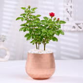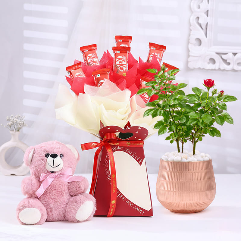 A blooming rose plant rests in a rose gold metal pot, accented with smooth pebbles that add a calm, finished touch. Paired with a cuddly teddy and a Valentine’s special pyramid box filled with KitKat chocolates, this arrangement speaks the language of affection without needing many words. Perfect for expressing love, care, or a heartfelt surprise, it suits Valentine’s Day, anniversaries, or moments when you simply want to make someone feel cherished. Price Breakup: Rose Plant In Rose Gold Metal Pot ₹675, Sweet Heart Kitkat Bouquet 8 piece ₹495, Purple 6 Inch Teddy ₹325