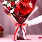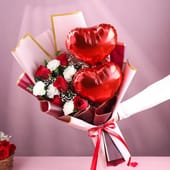 Here's a bouquet that speaks straight to the heart, blending romance and warmth. Five red roses add depth and passion, while five white carnations bring a soft, graceful balance. Two heart-shaped foil balloons sit beautifully within the arrangement, giving it a playful highlight that instantly catches the eye. Wrapped in premium paper with an elegant finish, this bouquet creates an experience that feels joyful and full of affection. It is the perfect surprise for your anniversary, Valentine's Day or other special moments.testing
