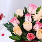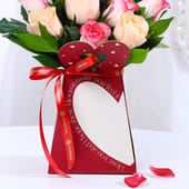 Nestled inside a charming love box, soft pink and peach Valentine roses come together in a harmony that mirrors affection and quiet admiration. Their gentle hues speak of comfort, closeness, and emotions that feel safe yet exciting. Each bloom carries a softness that lingers, turning a simple gesture into a lasting memory. Tied together with elegant detailing, the arrangement feels intimate and sincere, meant for moments when words fall short. Ideal for Valentine’s Day surprises or heartfelt confessions, this floral keepsake is designed to make hearts pause, smile, and feel truly cherished.