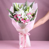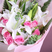 A bouquet that whispers elegance and tenderness, this arrangement features 5 pristine white lilies paired with 8 revival pink roses. The lilies bring an air of purity and serenity, while the roses radiate admiration and gentle affection. Together, they create a harmony of calm and romance, beautifully wrapped in pink non-woven paper and tied with a soft ribbon. The fresh greenery adds a natural balance, making the bouquet both vibrant and graceful. Ideal for birthdays, anniversaries, or heartfelt surprises, this bouquet captures emotions in every bloom, leaving a lasting impression of warmth, charm, and timeless beauty.