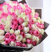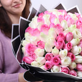 A stunning expression of love, this bouquet features 150 exquisite pink and white roses, beautifully arranged in premium black paper. The blooms symbolize admiration, affection, and sincerity, creating the perfect balance. Ideal for occasions like Valentine’s Day, this bouquet is a grand gesture to convey deep emotions. Whether you’re expressing your feelings to your sweetheart or surprising someone special, it makes for an unforgettable gift. These Valentine roses are truly a timeless choice to brighten your partner’s day with romance and beauty.
