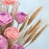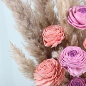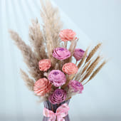 Soft hues and textured elegance come together in this thoughtfully arranged dried floral vase that feels calm, warm, and effortlessly beautiful. Featuring bleached pampas, delicate sola beauty roses in purple and pink, and rustic wheatgrass, it creates a balanced blend of softness and structure. Set in a clear glass vase tied with a gentle ribbon, this arrangement adds a soothing charm to any corner. Perfect for home décor, gifting, or creating a peaceful ambience, it brings lasting beauty without the need for care, making every space feel a little more special.