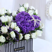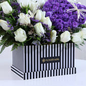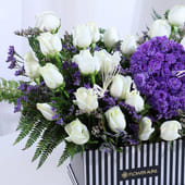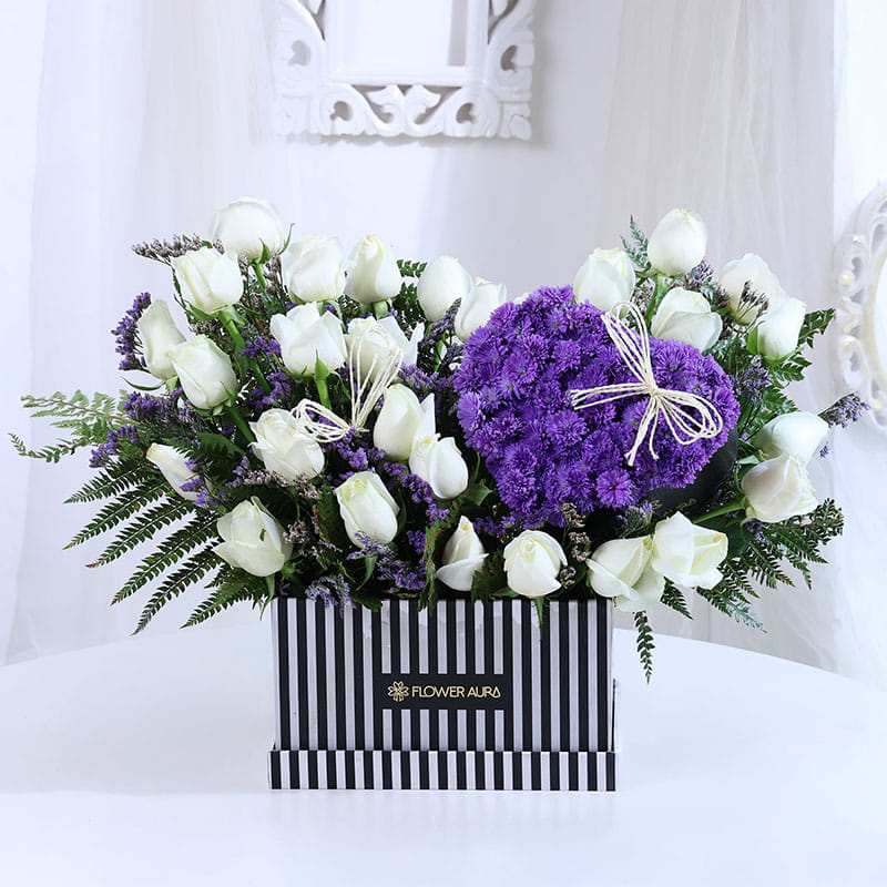 A heart-shaped cluster of blue local daisies sits at the centre, symbolising depth and quiet devotion, while pristine white roses surround it with grace and sincerity. Fresh fern leaves add texture and softness, completing the design with natural charm. Thoughtfully arranged in a striking black-and-white box, this Valentine flower arrangement feels expressive without being loud. Perfect for romantic occasions like Valentine’s Day, or meaningful gestures, it speaks through contrast, colour, and emotion, leaving behind a sense of calm affection that stays with the heart long after.