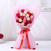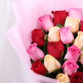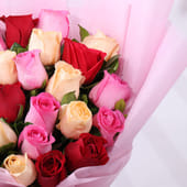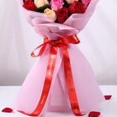 A beautiful bouquet of twenty delicate peach, red, and pink roses, wrapped in soft pink non-woven paper, perfect for expressing your love and affection. This thoughtful arrangement is tied with a festive red ribbon, adding a charming touch to any celebration or special occasion. Whether it’s for Valentine’s Day, an anniversary, or simply to say "I love you," this bouquet speaks volumes with its romantic hues and timeless elegance. A gesture that will bring a smile and fill the moment with love and warmth.